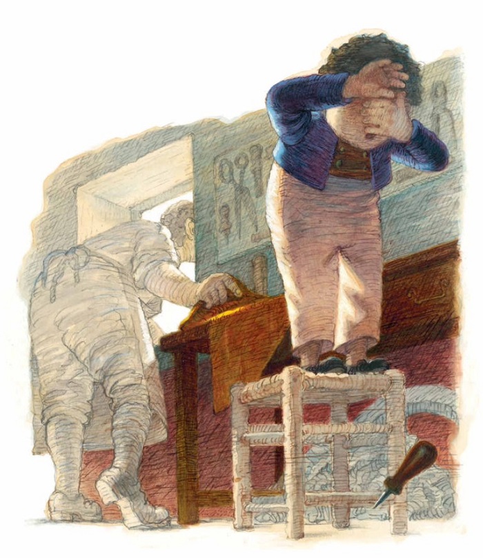 Aztán egyszer csak eljött a nap, amelyikről mindig is álmodozott. Az egyik könyv hatalmas puffanással landolt előtte az asztalon. De legnagyobb megdöbbenésére a betűk hatalmasak és a tapinthatóság kedvéért domborúak voltak, egy oldalra alig két mondat fért ki. A könyvek rövidek, lehangolóan rövidek voltak. Louis csalódottan sóhajtott fel: “Akár száz ilyen könyvet is elolvashatok, mégsem tanulok meg belőlük szinte semmit…”